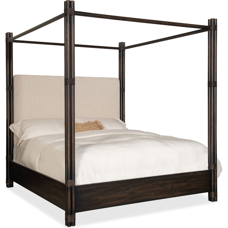 Retreat Pole Rattan Cal King Upholstered Poster Bed with Canopy – Dark Wood