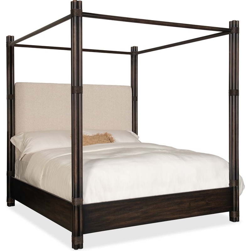 Solace Pole Rattan King Upholstered Poster Bed with Canopy – Dark Wood