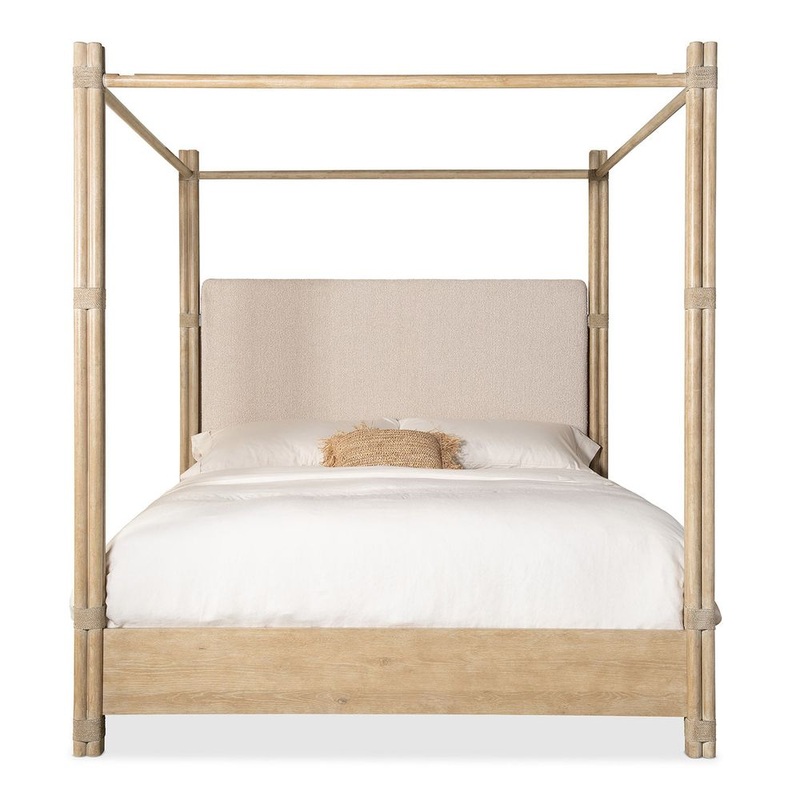 Solace Pole Rattan Cal King Upholstered Poster Bed with Canopy – Light Wood