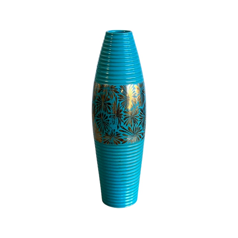 Italian Turquoise and Gold Floral Hand-Painted Ceramic Vase, 1960s
