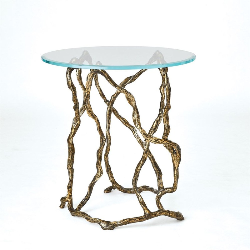 Two Drawer Side Table With Large Satin Brass Square Hardware In White Textured Linen With Glass Top