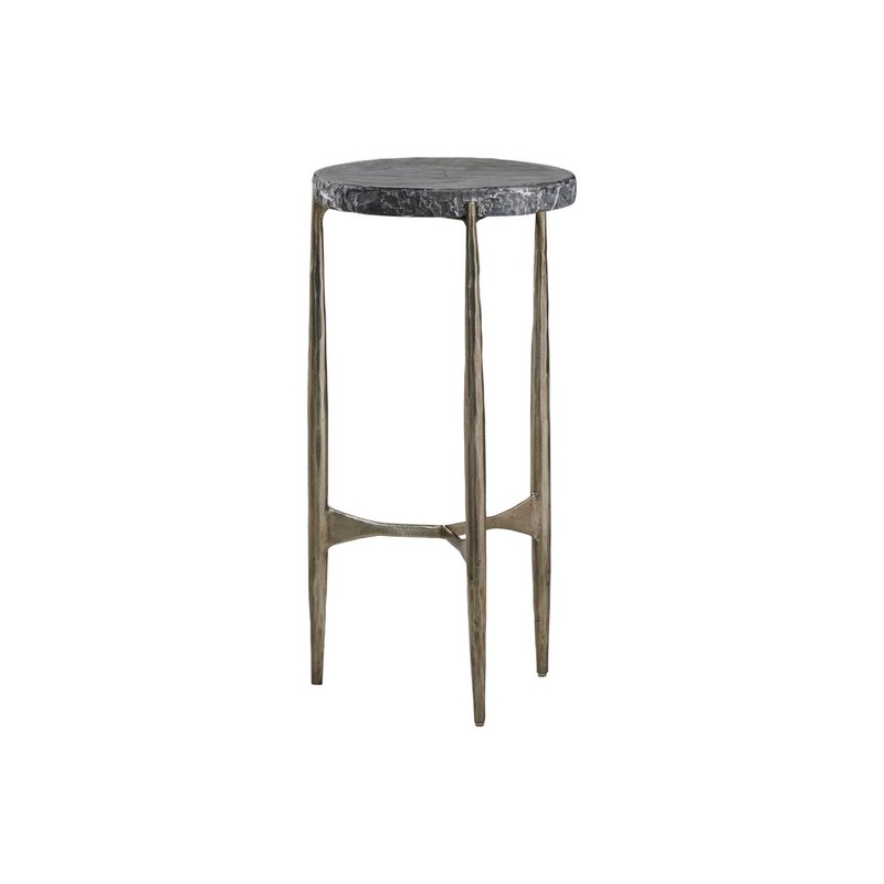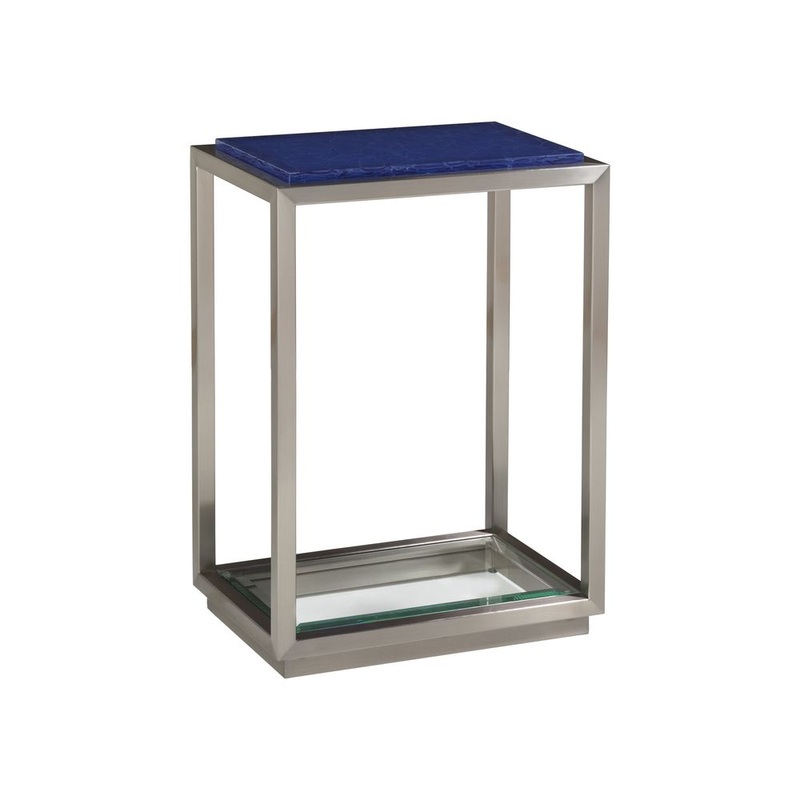 Two Drawer Side Table With Large Satin Brass Square Hardware In Blue Dyed Grasscloth With Glass Top
