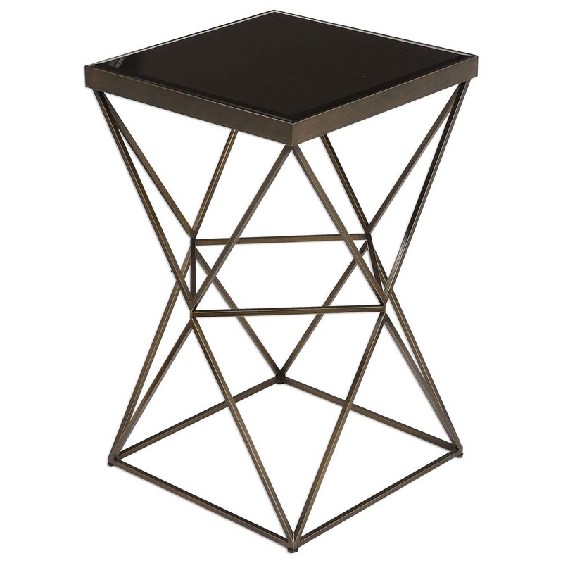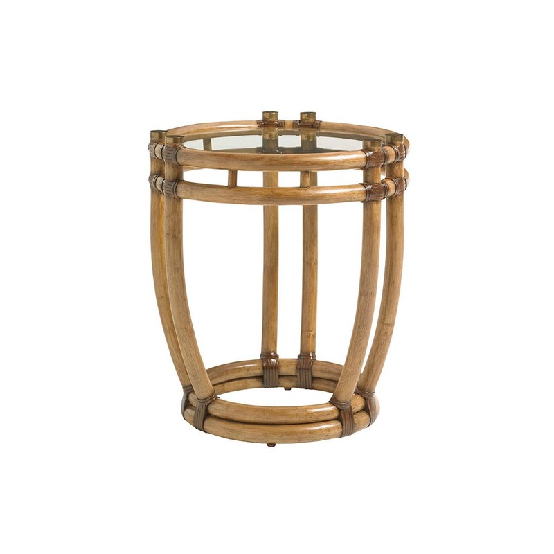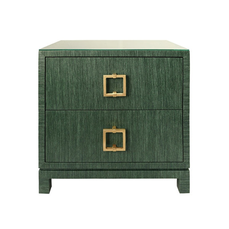 Two Drawer Side Table With Large Satin Brass Square Hardware In Green Dyed Grasscloth With Glass Top