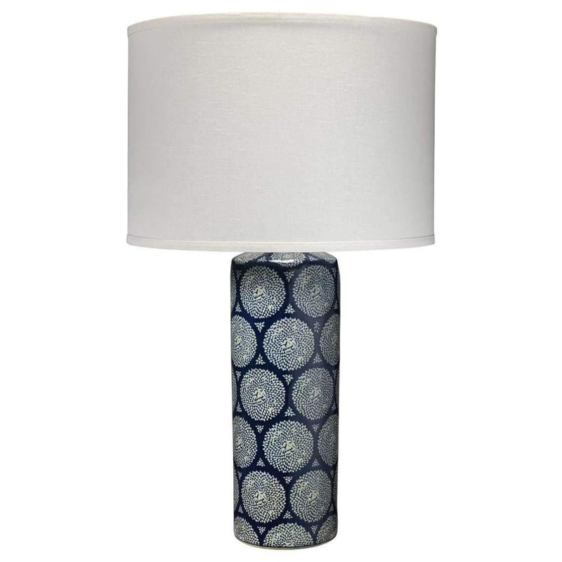 Neva Table Lamp in Blue and White Ceramic with Classic Drum Shade in White Linen