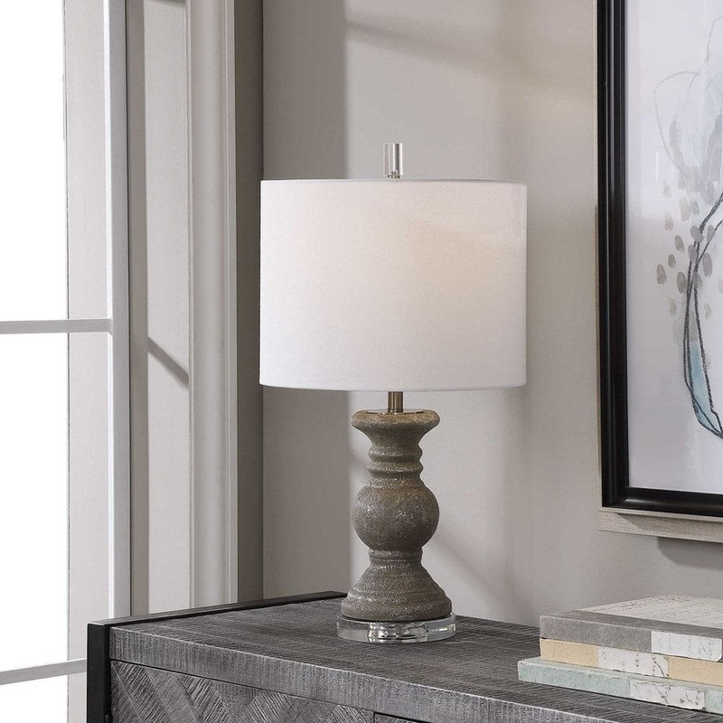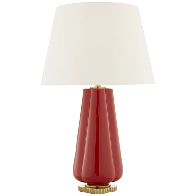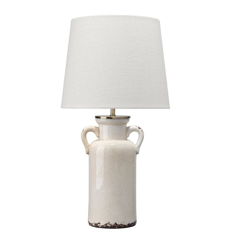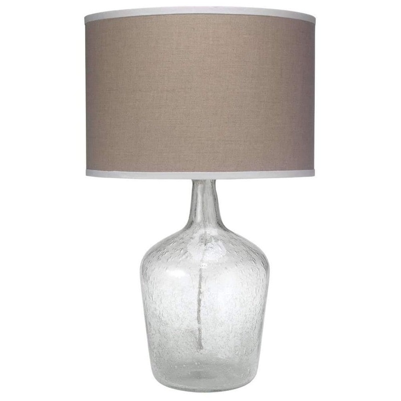 Plum Jar Table Lamp, Medium in Clear Seeded Glass with Classic Drum Shade in Natural Linen with White Linen Trim