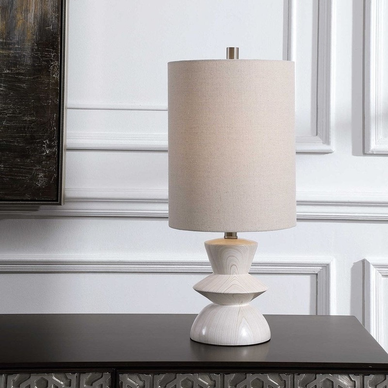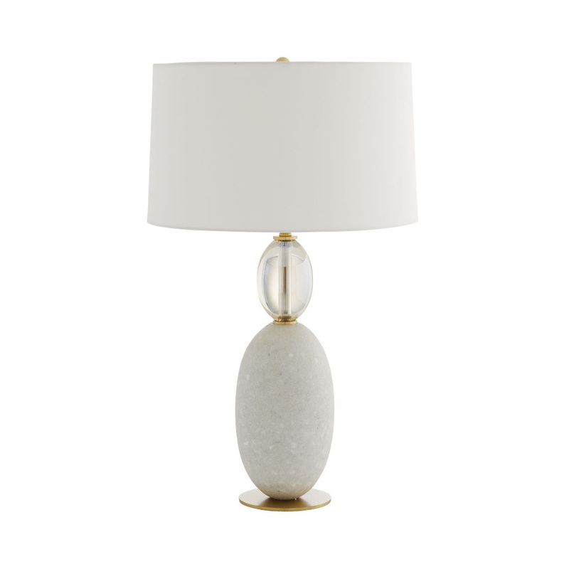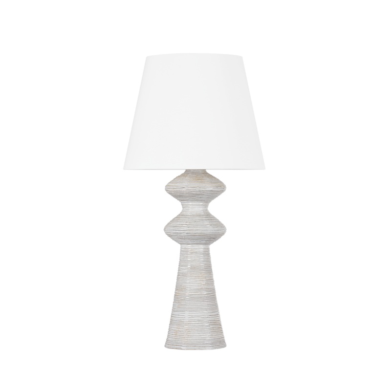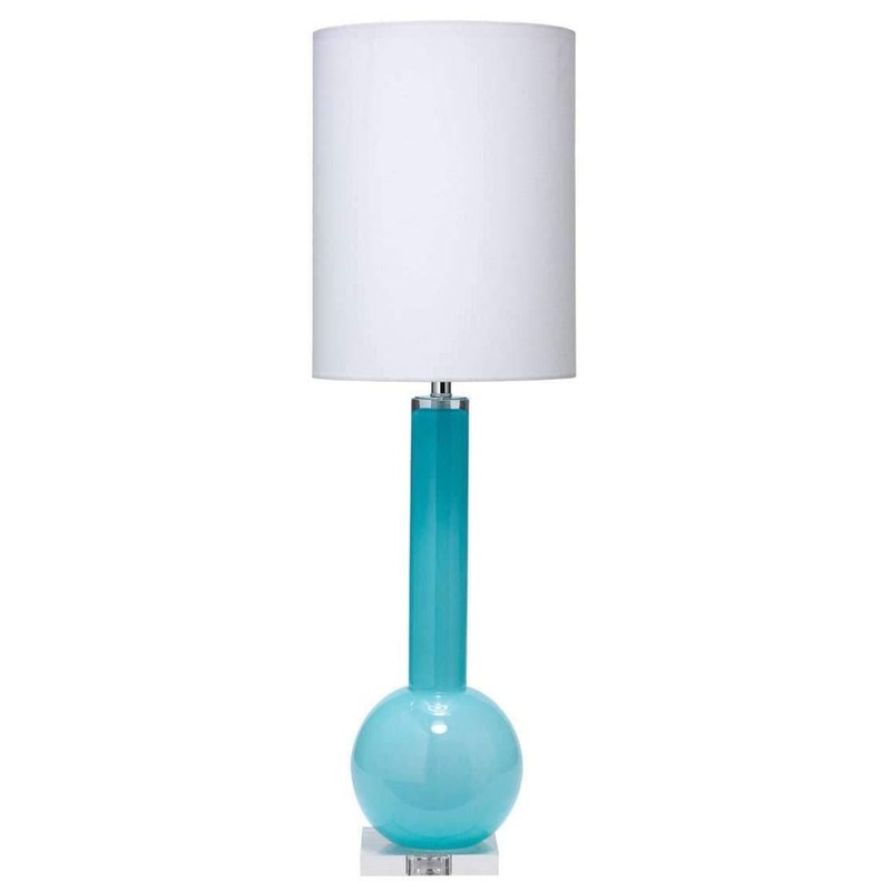 Studio Table Lamp in Powder Blue Glass with Tall Thin Drum Shade in White Linen