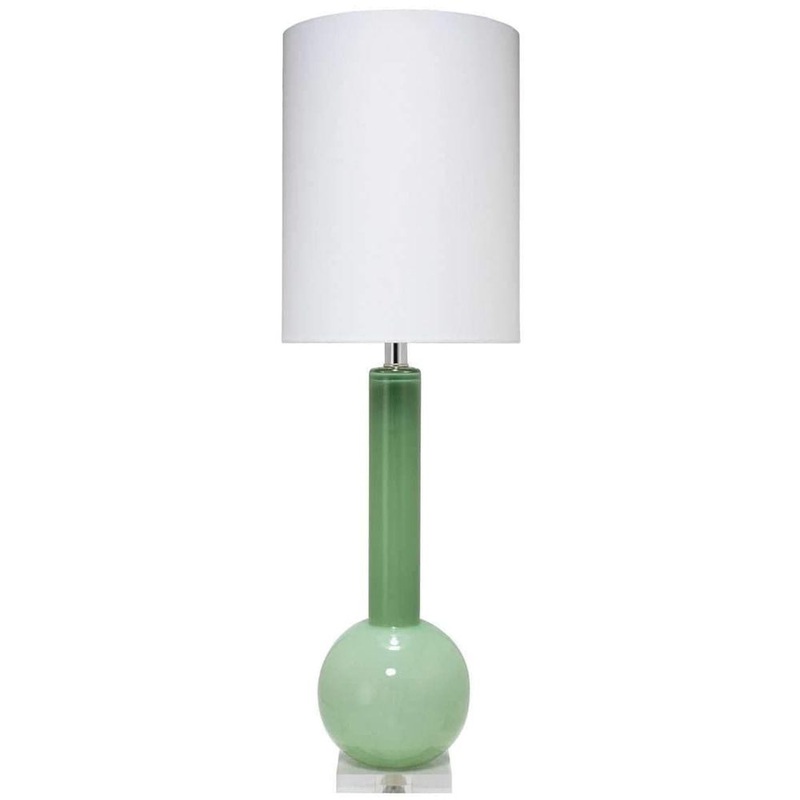 Studio Table Lamp in Leaf Green Glass with Tall Thin Drum Shade in White Linen