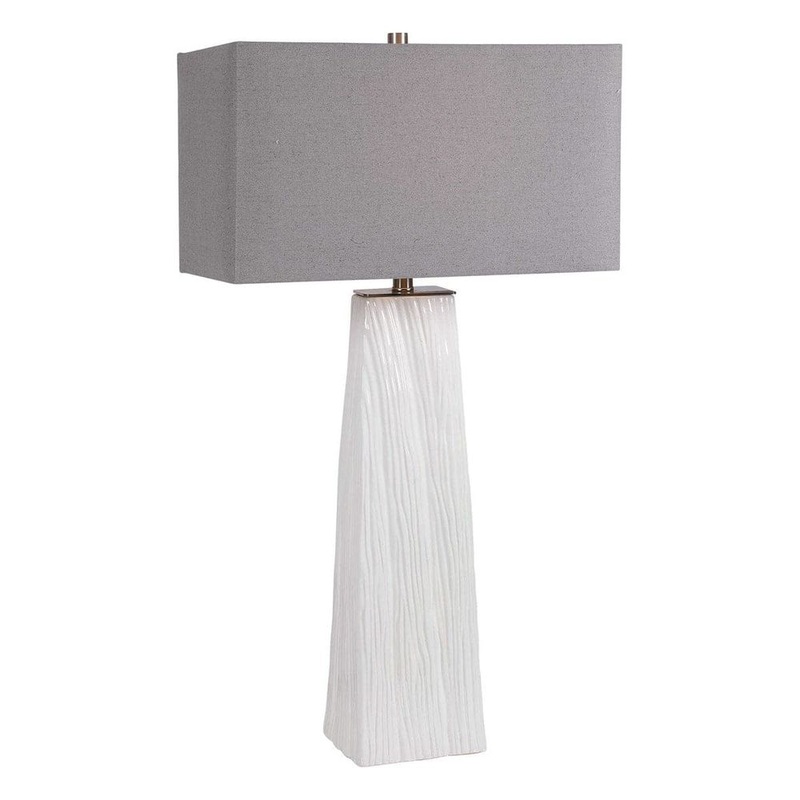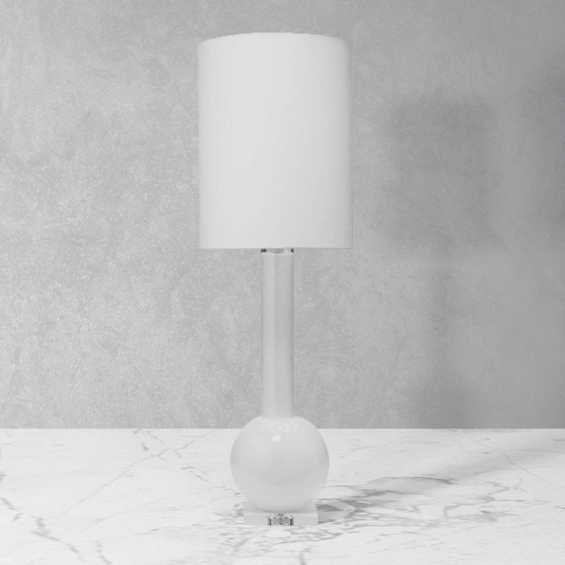 Studio Table Lamp in White Glass with Tall Thin Drum Shade in White Linen