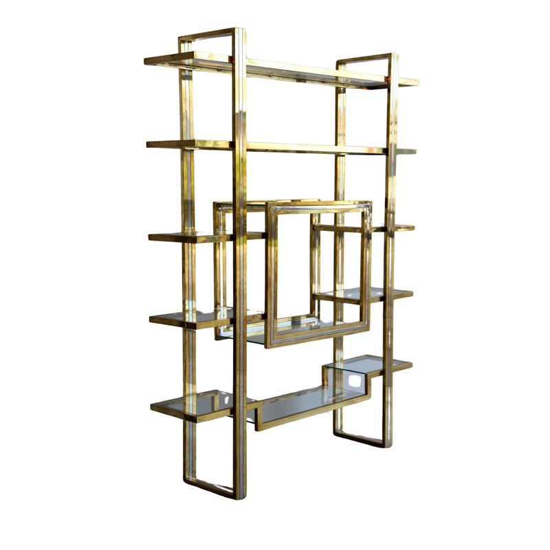 Romeo Rega Large Standing Brass, Chrome & Glass Bookshelf 1970s
