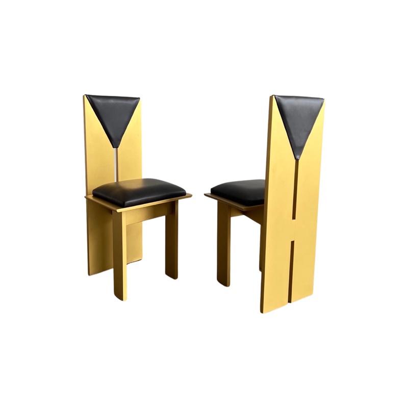 Italian Dining Chairs Art Deco, Pair of two in Gold Laquared Wood and Black Leather, 1980s