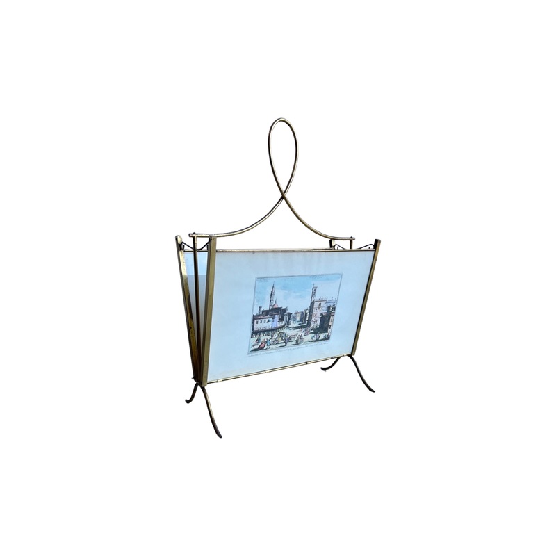 Italian Magazine Holder in Brass and Glass with Florence imagines on Both Sides , 1950s