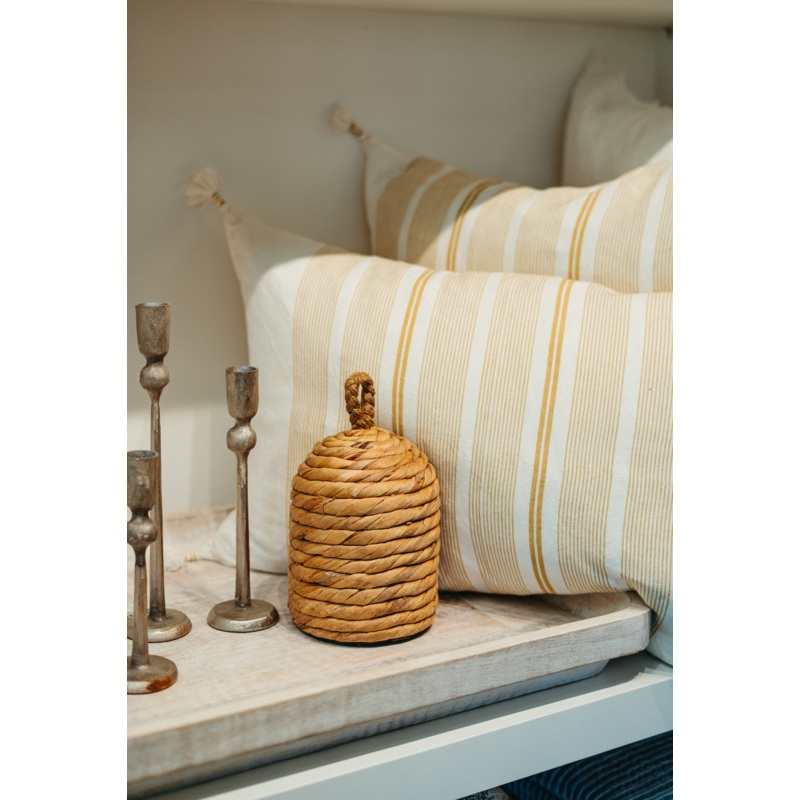 The woven ochre stripes of the Cape May Linen Pillow are woven and not printed for an extra fresh and crisp look. With classic pinstripes and hand wrapped tassels at each corner, this pillow styles well with coastal and monochromatic colour palettes for contemporary feeling layered sofas and beds. Complete with a premium feather down filler for fabulous fluff factor and comfort you’ll want to sink your head into. Machine Wash Gentle.