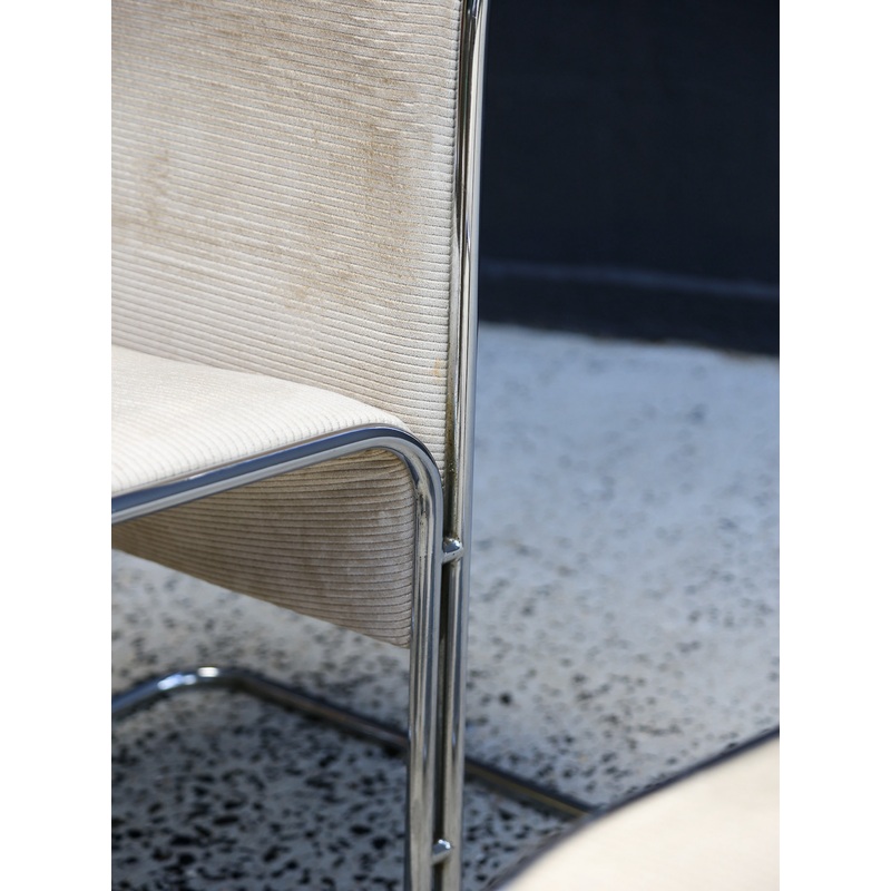 A set of seven Calla dining chairs designed by Antonio Ari Colombo for Arflex, Italy, in the 1970s. With their curved chromed frames and soft corduroy upholstery, these chairs embody the sculptural elegance of Mid Century Modern Italian design.