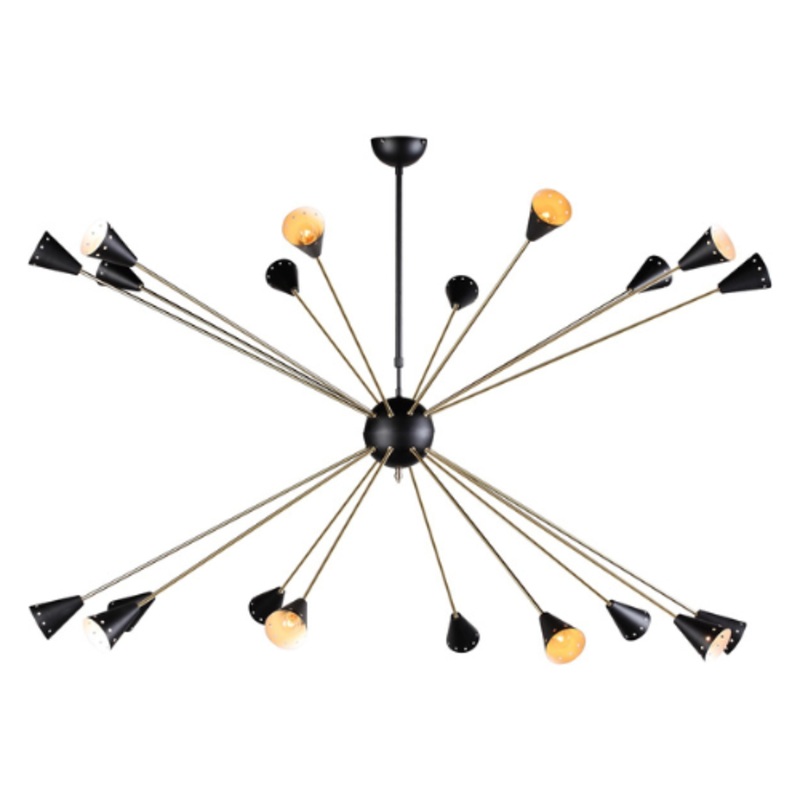 A classic of mid-century modern design, this grandiose sputnik chandelier will make a real statement in any modern space. Radiating out of a central sphere, 20 long arms reach outward, each topped by a cone-shaped shade. Each shade has a matte black finish exterior, and white finish interior to help reflect the light from the 25 watt candelabra bulb within. The matte black and brushed brass finishes create a sophisticated combination that will look great in a variety of decors. With bulbs pointing in numerous directions this chandelier is ideal for ambient lighting.