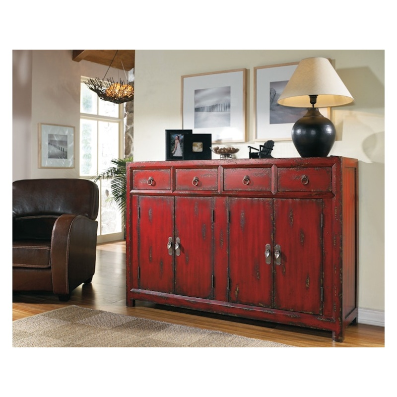 A stunning focal point piece, this rich red hand painted cabinet with an Asian flair adds both a dash of color and style and hard-working storage to your home. Crafted of wood veneers, the cabinet has four drawers and four doors with one adjustable shelf behind each. 58 ? W x 15 ? D. This tall-waisted Asian inspired console features the appeal of a unique size. It has four drawers, four doors with one adjustable shelf and a rich red finish.