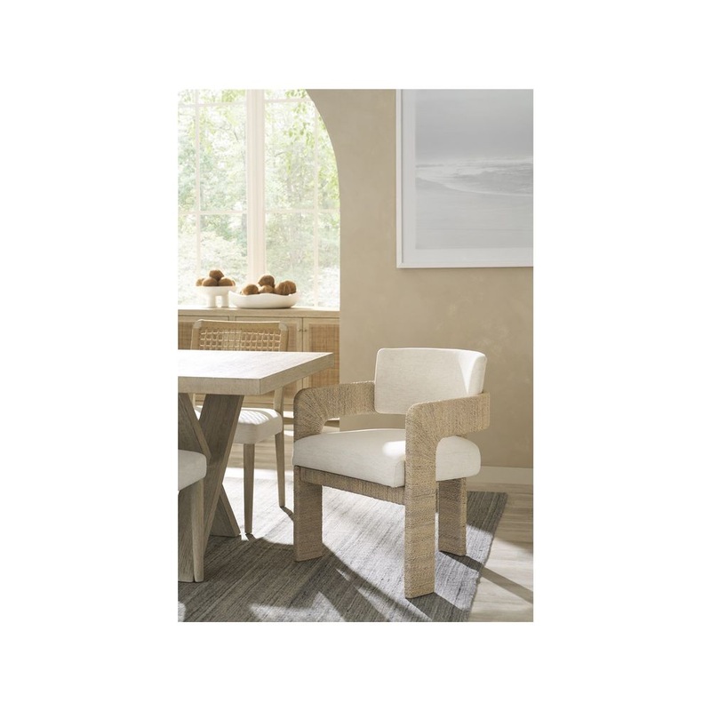 The Abaca Arm Chair is wrapped in natural abaca fiber, combining organic texture with comfortable upholstered seating in Nomad Snow fabric. This dining armchair with 31-inch height and 19-inch seat height provides perfect dining comfort while bringing natural materials and coastal warmth to your dining space.