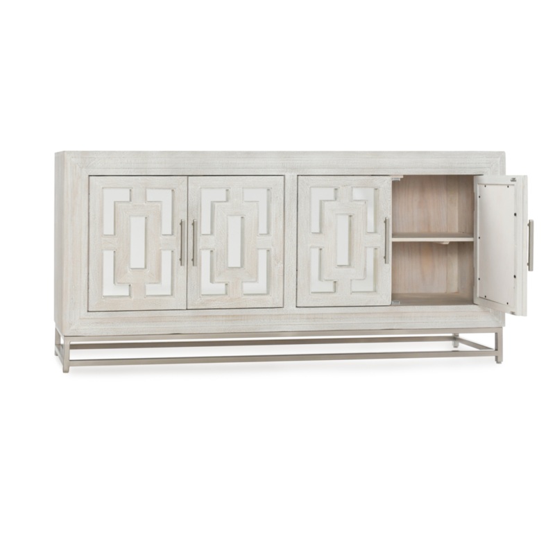 Indulge in luxury with the Adina Mango Wood Cabinet. Handcrafted from solid mango hardwood, mirror, and cast iron, this artisanal piece exudes elegance with its white wash finish and nickel hardware. FSC-certified wood promotes responsible sourcing while adjustable shelves and wire management make organization a breeze.