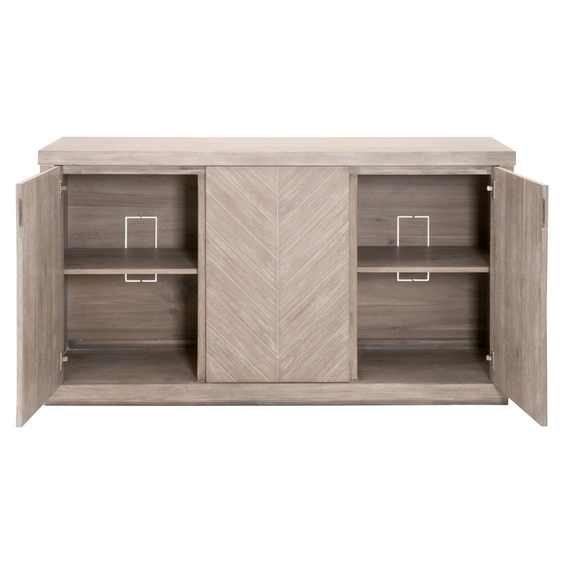 This transitional sideboard features a beautifully crafted chevron design accenting the cabinet doors. It includes 3 storage cabinets with interior shelves, providing plenty of space to store dishes, china, and much more. This sideboard can be used as a buffet or media sideboard, as it comes equipped with a handy cord management system. Made of acacia wood and accented with grooves for a natural finish, this sideboard has a transitional look that will be a great addition to your dining room.