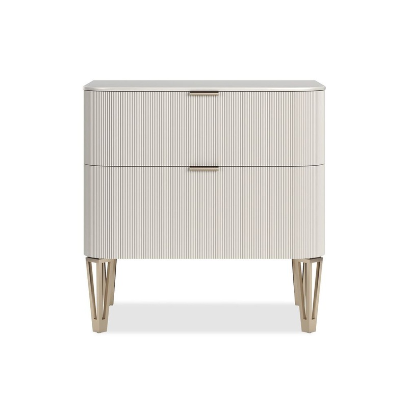 This is a more petite version of our True Love nightstand. A lustrous palette of Matte Pearl and Whisper of Gold highlights its rounded silhouette and fluted surfaces. Like the perfect earrings complete an outfit, this nightstand’s glimmering tapered feet in Whisper of Gold add an unforgettable finishing touch. This piece has two under-mount drawers.