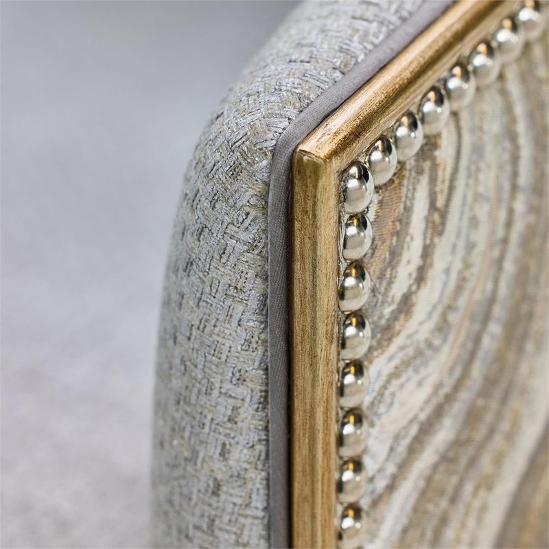 Agate Slim Swivel Chair is a gorgeous seating solution with a sleek silhouette that infuses a space with regal tones. Constructed from beech wood, the piece features exterior upholstery in a pleated Benchmark Agate 7008 fabric with nailhead trim in Nickel. The cushion and backrest are shown in Precious Metal Pewter 3056 with welt trim in Gimlet Platinum 1115. Subtle accents in a Valyrian Gold finish complete the look.