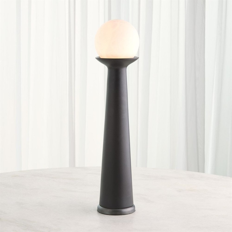 Description: Transform your space with the Alabaster Bulb Tower Lamp. This elegant piece combines Portuguese slip-molded ceramic with an Italian alabaster bulb, casting a warm glow that showcases the stone’s beautiful details. As alabaster is a natural product, please be aware that there will always be variations in veining and color. We celebrate these differences, as they give each piece its unique character, making them one-of-a-kind creations.