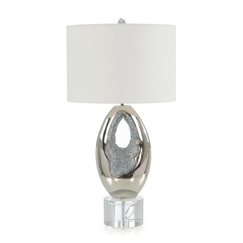 Description: This abstract oval shape table lamp in a polished silver is finished on the inside with blue glass nuggets and sits on a large cylinder acrylic base.