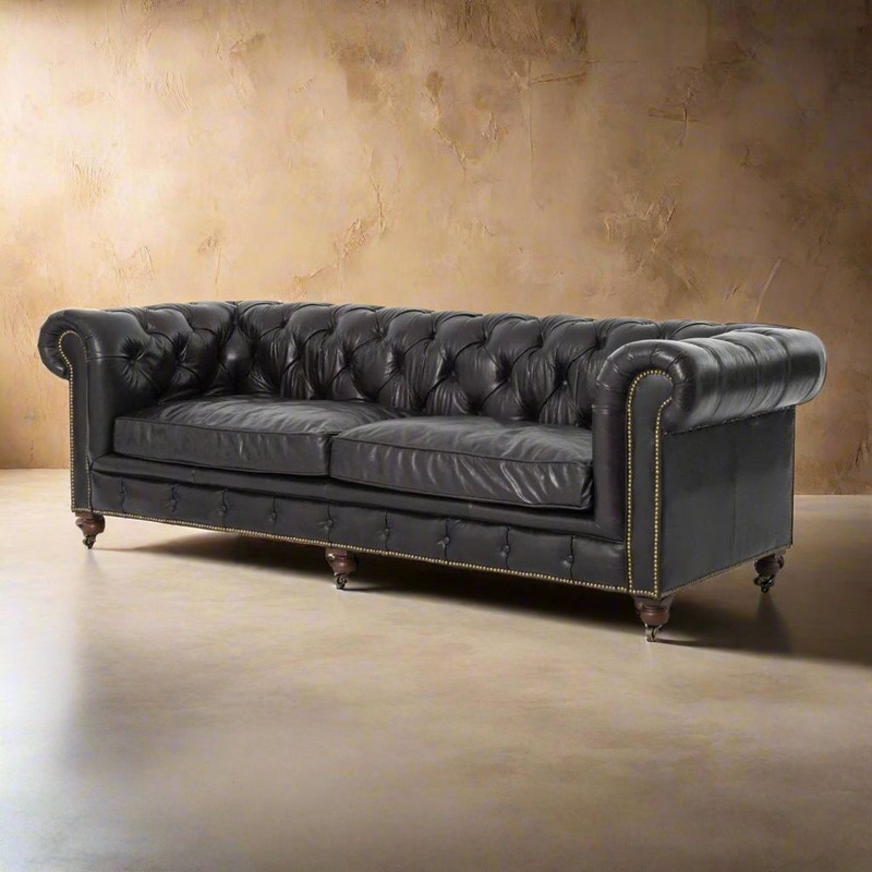 - Description: This dramatic Chesterfield sofa has a grand, men’s club feel. Black saddle-toned, top-grain leather is lovingly aged – an effect that will intensify beautifully in time.