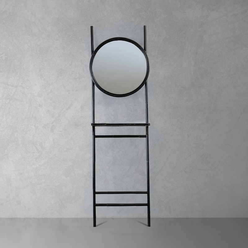 Simply styled with a clever play on shape, this standing mirror will instantly improve any space. Black finished rattan supports a rounded mirror and features rungs perfect for holding blankets, towels, or scarfs. This piece is ideal for bedrooms, bathrooms, and entryways.
