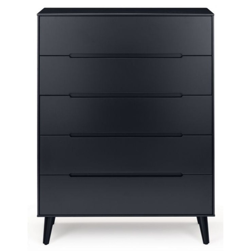 A stylish, retro-inspired chest with five large drawers in an immaculate matt anthracite lacquered finish, with complementary tapered black finish legs and recessed handles to provide easy opening. The sleek Scandinavian feel fits beautifully with any dcor.