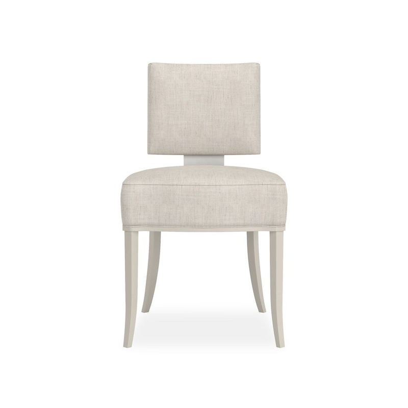 This contemporary side chair takes on dramatic style when you view the wide, Lightly Brushed Chrome panel that shines off its back. Neutral fabric fully surrounds the square upper back and seat cushion that rest on an exposed wood frame, sabre legs and gracefully curving arms finished in Matte Pearl. This is a low, klismos chair with truly polished appeal.