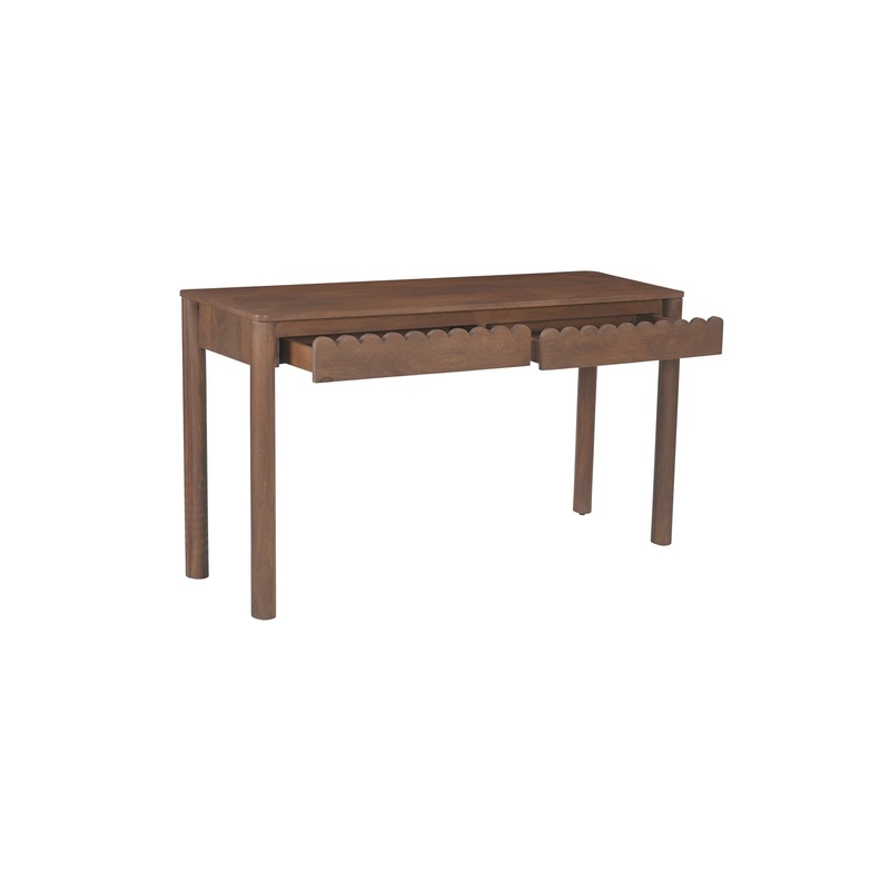 The Amary Console Table is a stunning homage to traditional Shaker design. Its modern aesthetic is complemented by geometric curves and post legs, providing a captivating touch of modernity. Delicate scalloped edge details to the two drawers provide a timeless charm, perfect for any sophisticated home.