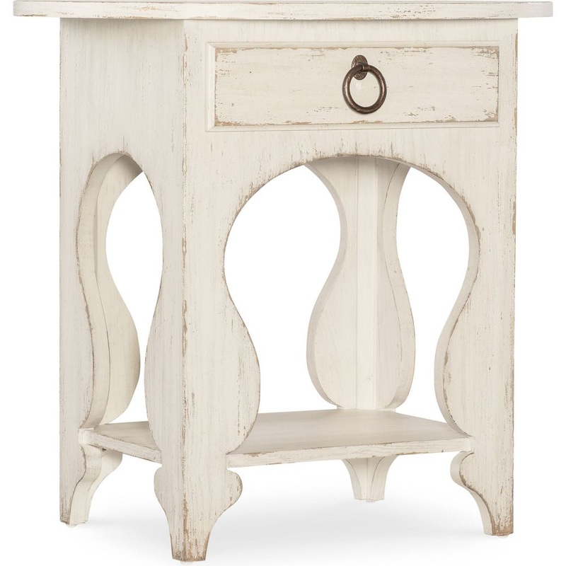 Description: In a classic, charming design with a nostalgic flair, the Americana One-Drawer Oval Nightstand has ornately shaped legs that form the shape of a keyhole on the front, sides and back. Crafted of Oak Veneers, it is finished in the timeworn white Daisy finish, with drawer interiors in the warm Honey finish. The drawer is self- closing.