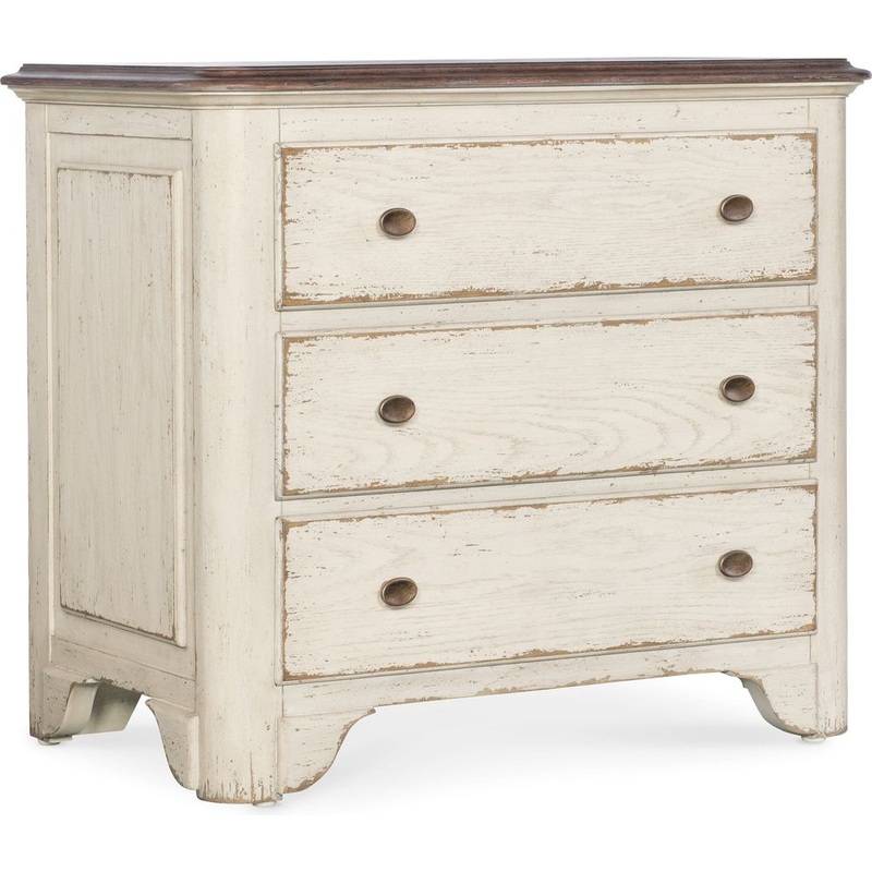 Description: In a two-tone finish with the time-worn white Daisy on the base and the warm Honey on the top and drawer interiors, the Americana Three-Drawer Nightstand is a classic, charming design with nostalgic flair. There are 3 self-closing drawers and a solid-wood edge top. Crafted of Oak Veneers with metal alloy pulls in an antique bronze finish.
