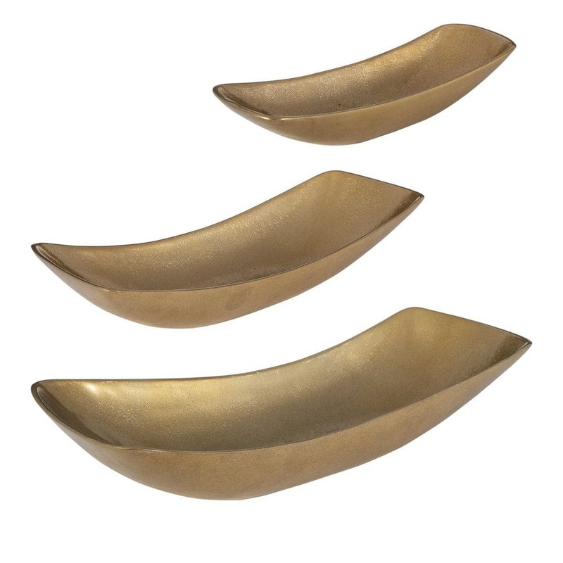Set of three, textured cast aluminum bowls feature an antique brass finish. Sizes: S-13x3x4, M-16x4x6, L-20x4x8