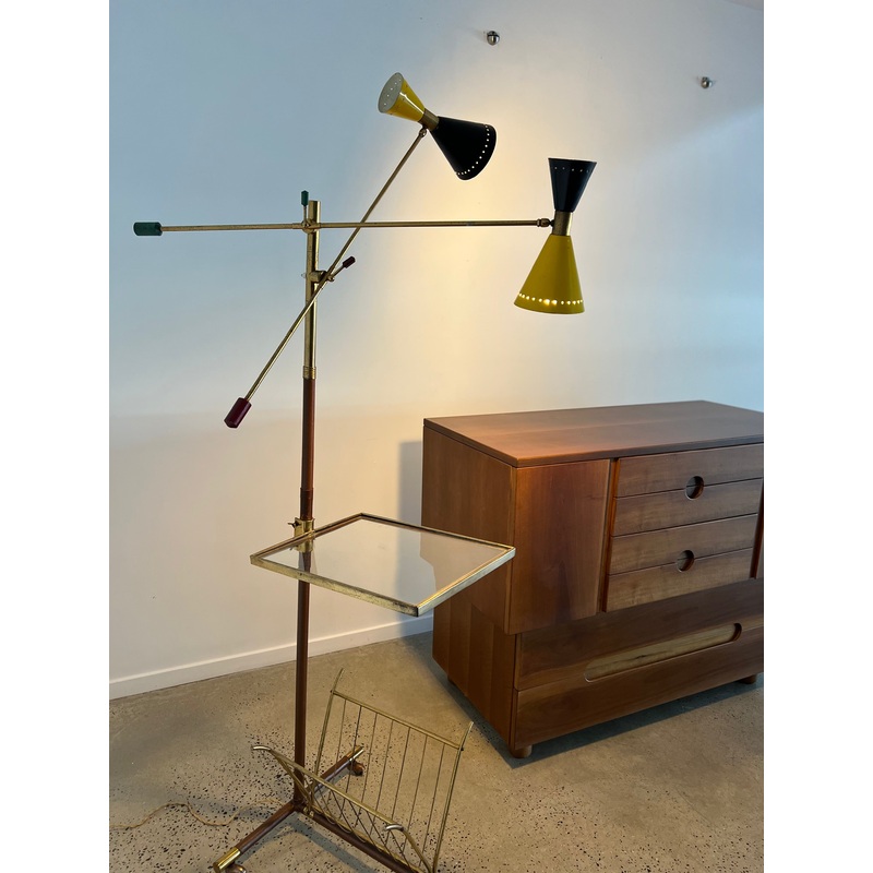 This rare and iconic floor lamp by Angelo Lelli for Stilnovo combines sculptural design with everyday functionality. Featuring adjustable dual-cone lights, a glass table tray, and an integrated magazine holder, it exemplifies the elegance and innovation of Italian mid-century modern lighting.