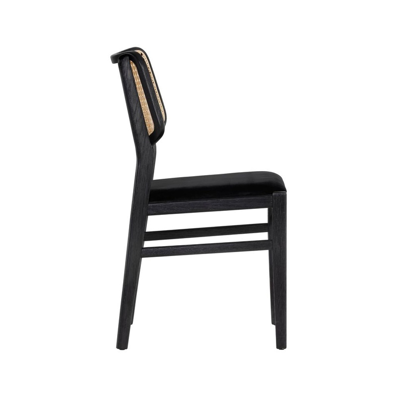 Description: This stylish dining chair will bring life to any living, lounge, office and dining space. Features a beautiful black seat with a natural rattan seatback. A solid black oak wood frame complete this naturally edgy design. Handle With Care: This design has been crafted with rattan. This artisan-crafted material features intricate weaving that results in natural variations where no two pieces are alike. Colour and texture differences are to be expected and embraced with this natural material. Due to the weaving process used, the fibres in this material may display shorter or longer lengths where the weaving ends. Visit our Product Care page for more information on how to ensure the lasting beauty of this piece.