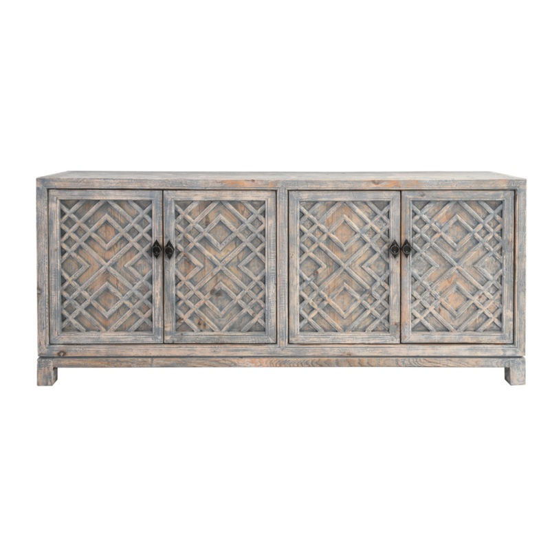 Introducing the Antigua Reclaimed Pine Cabinet Timeworn Gray, a sophisticated addition to any living space. Crafted from reclaimed pine with a vintage blue finish, this hand-finished and hand-carved Antigua 4Dr Sideboard exudes an heirloom quality. Enhance your interior with distinguished and character-filled furniture.