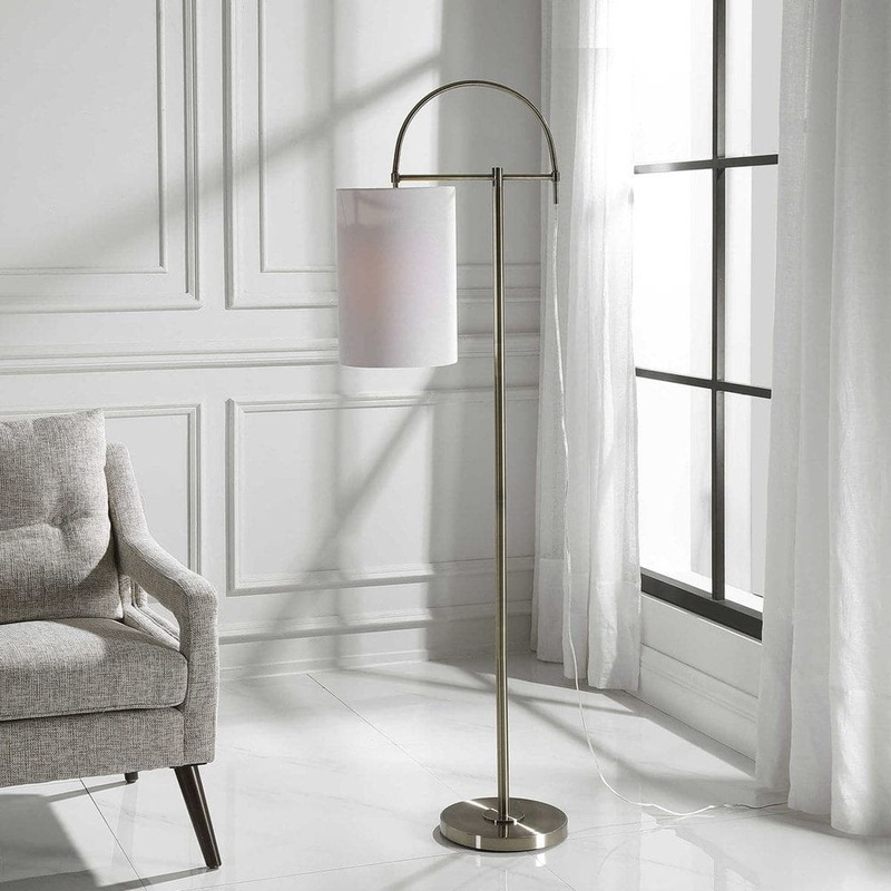 This floor lamp features an arc style base finished in an antique brushed brass. The round hardback drum shade is a light beige linen fabric.