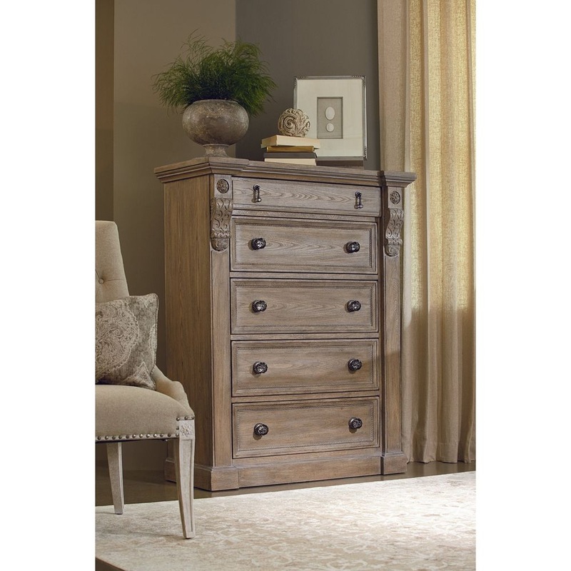 The sturdy side posts and carved corbels on the five-drawer Jackson Drawer Chest were inspired by stone fireplace; the chest is further embellished with smoked acrylic drawer hardware. The Jackson Drawer Chest is constructed of Elm and Parawood solids and cathedral elm veneers, and is available in Parch, a light open-grained finish with a worn, sun-bleached look.
