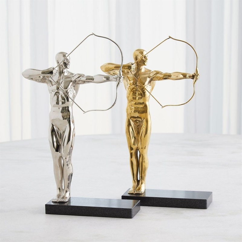 Description: Bullseye! The Archer scores with this exquisite sculpture, handcrafted from cast brass and iron, boasting a brass or nickel finish and confidently positioned on a black granite base.