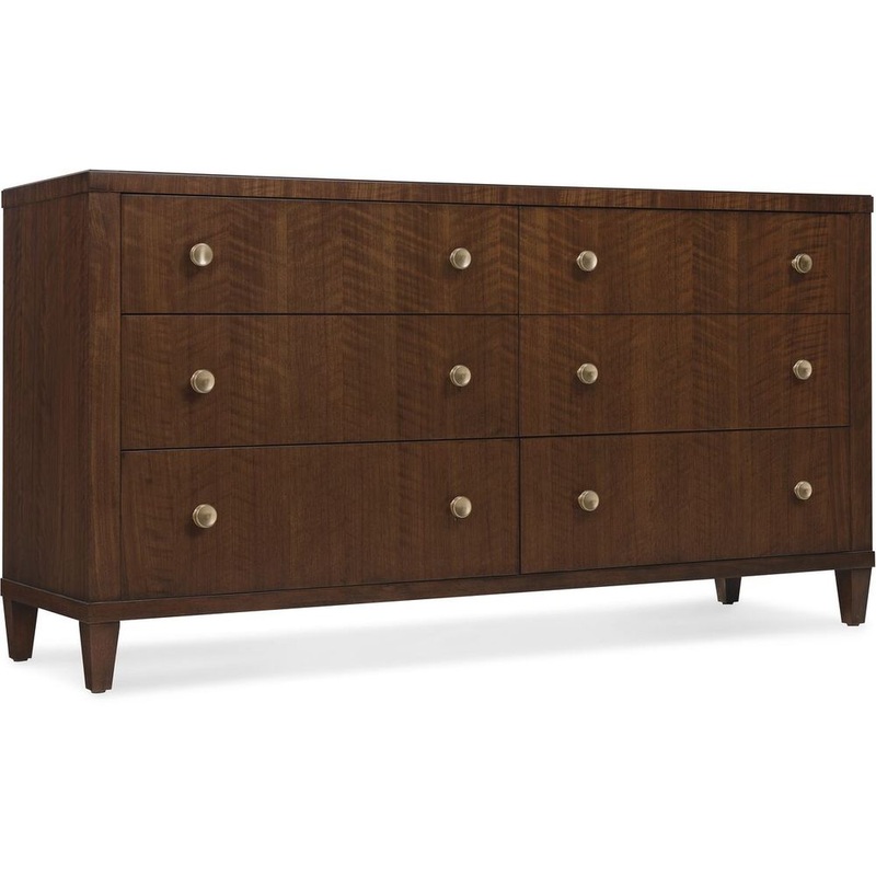 The Archives Six-Drawer Dresser offers timeless elegance with a modern touch, perfect for bedroom storage. Crafted with figured quartered walnut veneers and oak veneer accents, this piece showcases a rich Classic Walnut finish. It features six spacious drawers, with cedar-lined bottom drawers and a jewelry tray. Satin brass custom knob hardware adds a luxurious touch to this refined design, making it an ideal choice for both traditional and modern interiors. Archives taps in to a design trend that mixes modern, trendy styles with historic elements, known as “hipstoric”. Complementing a variety of design styles with timeless forms and elements, the trend creates a sense of undeniable luxury. Layering rich and authentic materials, such as figured walnut veneers, top grain leather, woven raffia, and polished marble, Archives assortment speaks to consumers who yearn for structured elegance with a dash of mystery