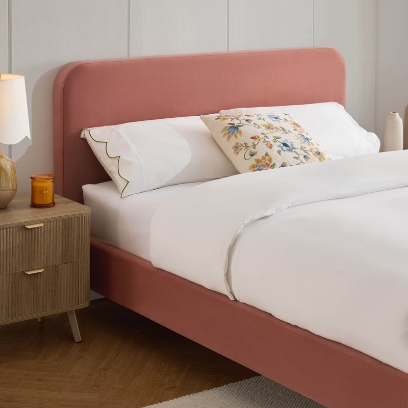 Made with a fun Apricot premium matte velvet fabric, the Ascot bed frame will blend seamlessly into any classic or contemporary bedroom interior. With a soft, curved headboard for a smooth and modern feel, it also features solid warm oak wooden legs for a touch of traditional style.