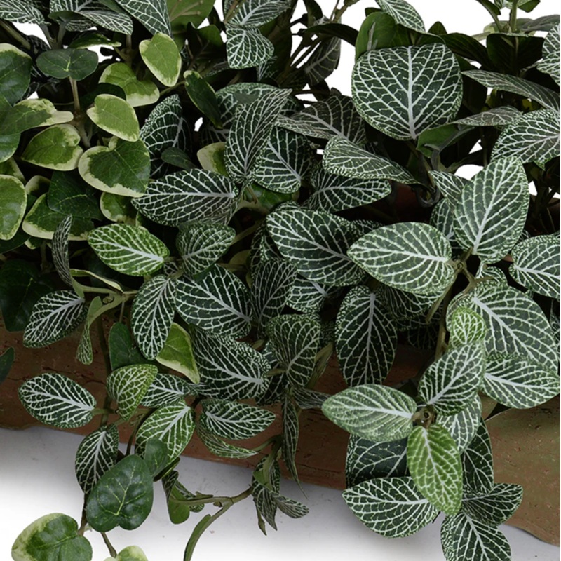 Elevate your indoor spaces with our Assorted Greenery in long clay planter. Enjoy the biophilia benefits of Fittonia and Pumila bushes without the upkeep. The velvety green leaves of Fittonia and bright green foliage of Pumila, planted in a 14″ natural clay planter, are finished with our realistic faux Durt. Versatile and fire retardant, this luxury planter is perfect for any elegant setting.
