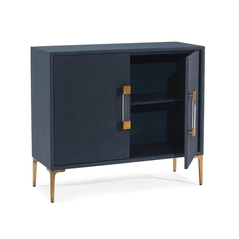 Description: A two-door cabinet inlaid in linen and finished in indigo batik sits atop four aluminum bracket feet. Acrylic and metal hardware finished in brass decorate each door.