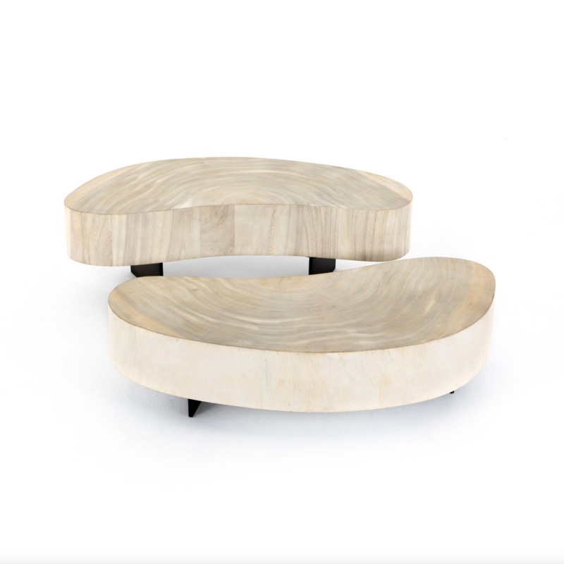 Natural beauty – total novelty. Oyster-cut Guanacaste forms kidney-shaped coffee tables in varied heights, creating a beautifully layered look. Visible veneer rings speak to woods’ natural graining, while a dark gunmetal-finished base provides clean contrast to the whole look. Tables sold separately or as a set. Tall table measures 49.5″x24″x15.75″; short table measures 49.5″x24″x11.75″.