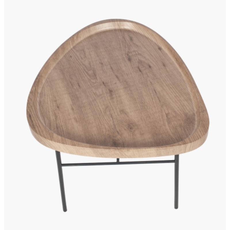 This stylish oak wood effect top side table looks great on its own or coupled with the equally stylish coffee table. The stunning teardrop-shaped top gives this well-crafted side table a unique and modern feel. Its black metal sleek legs are modern in design and would suit any contemporary interior.
