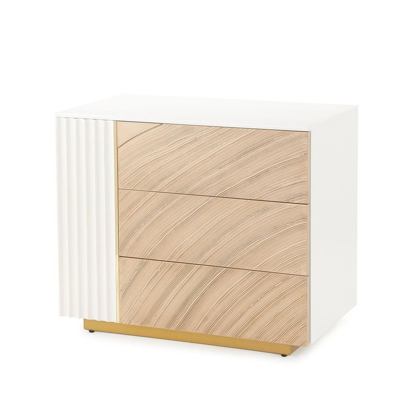 TheAxisThree-Drawer Chest is an innovative collaboration with renowned abstract artist, Carol Benson-Cobb. Crafted from tulip wood, the piece draws inspiration from traditional pottery techniques. Three push-latch drawers are adorned with a dimensional motif reminiscent of raked clay, finished in a warm Terracotta hue. A corner compartment with a fixed shelf fluted detailing and a crisp Palazzo finish, matching the rest of the frame. English Brass trim and a matching plinth base provide a refined finishing touch, further elevating the designs sculptural presence.