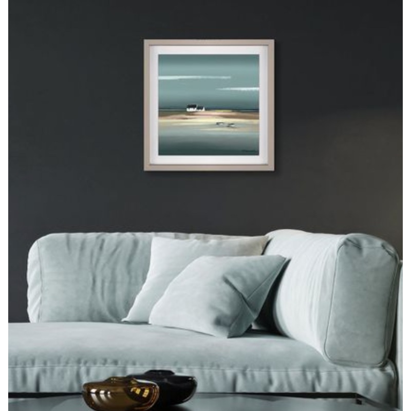 Two boats beached at low tide mimic the two high and dry cottages ashore in Ulyana Hammond’s serene seascape with a cool, calm palette of greys, greens, earthy browns and salmon pinks.