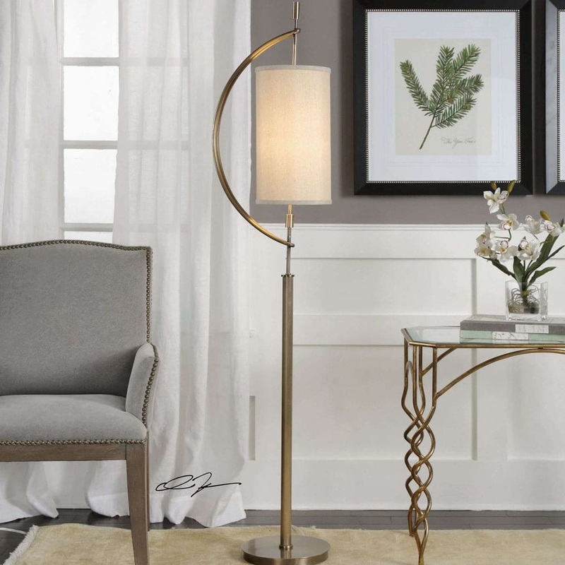 Antique Brass Plated Steel, Featuring A Gracefully Curved Double Banded Design That Gives The Illusion Of A Suspended Shade. The Tall, Round Hardback Shade Is A Light Beige Linen Fabric With Natural Slubbing.