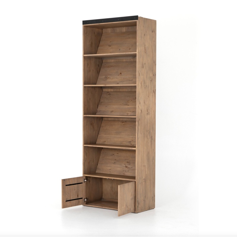 Made from smoked solid pine, five spacious shelves are ready to store favorite books and treasures. Removable ledges slant at an angle on each shelf, for even-better display of art and coffee table-size books.